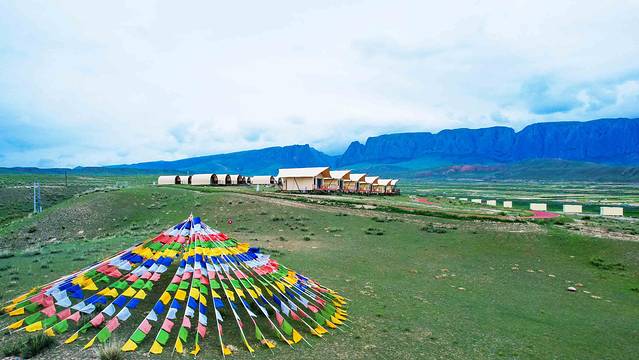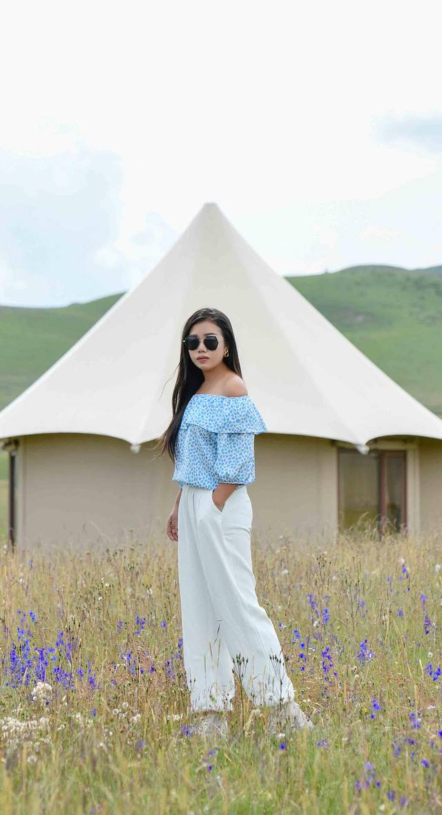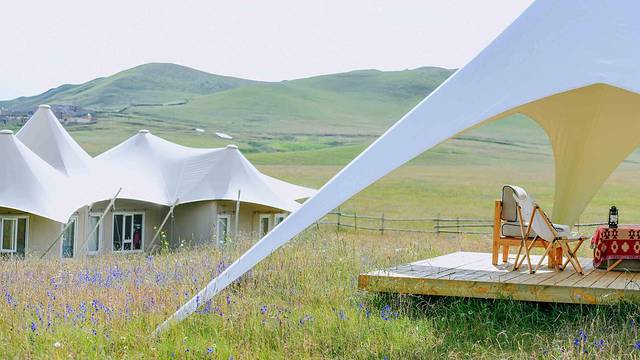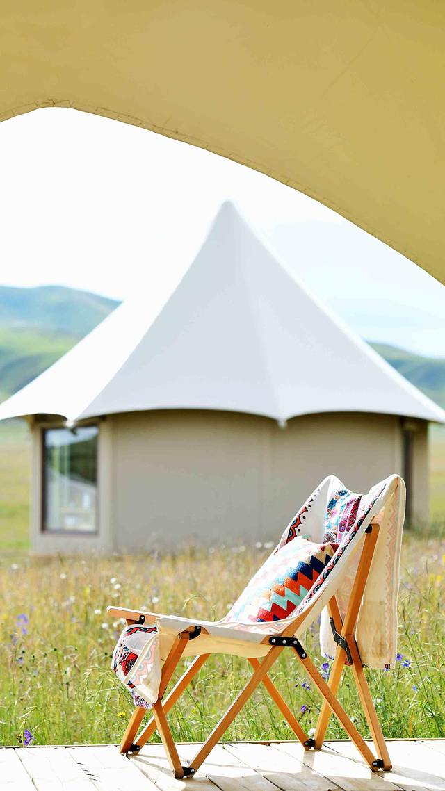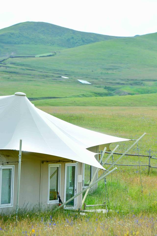 神山下,白色的帐篷酒店如同一颗颗珍珠般镶嵌在一望无垠的草原上。别致的玻璃账房设计让人一眼便能看到房间外的风景。房间里,装饰物和家具大多采用的都是原木色系。这样的色彩搭配不仅能给人带来舒适,还能让人感到温馨。帐篷外,远处连绵不绝的山脉在蓝天白云的渲染下显得格外耀眼。草原上长满了青草,夹杂其中的还有五彩缤纷的花朵。这些小小的花骨朵在牧野绚丽的绽放,散发出了自己的光彩。明媚的阳光,湛蓝的天空,无垠的草原,美丽的花海,轻柔的微风,五彩的经幡…这些元素造就了一个独属于阿米贡洪的童话世界。