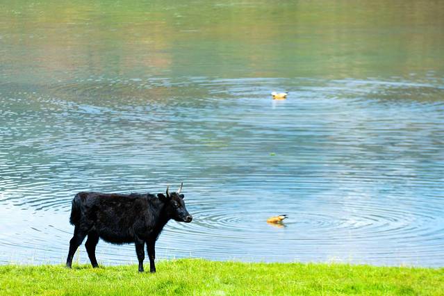 走进当周,第一眼看到的便是青葱翠绿的草原。无边无际的草原一直延伸向远方,以起伏的山峦做为交界点,连接了万里晴空。微风吹过,青草和野花也随之起舞。这时若是身穿长裙置身于花海草场中,一定唯美至极。成群的牛羊在草原上悠闲的逛着,他们时而低头觅食,时而趴下休息。