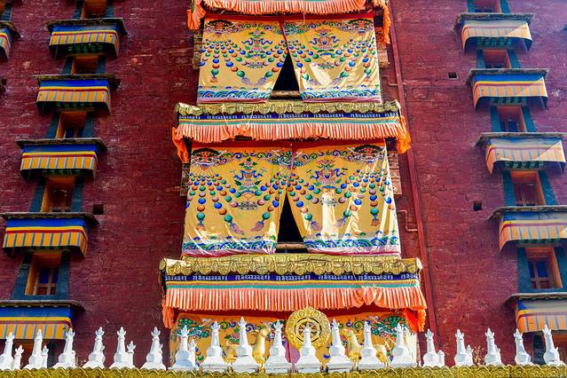 佛阁的每一层都有不同的主题,都代表了藏传佛教的一个派别或时代,而且还包括了已经被神化的藏族历代文化名人,比如:创制藏文的吞弥·桑布扎,藏戏之祖唐东杰布,藏药鼻祖宇妥·元丹贡布等等,当然,除了这些,更少不了松赞干布和文成公主。内部供奉着1720尊各类佛像,绘满了巨大的壁画。