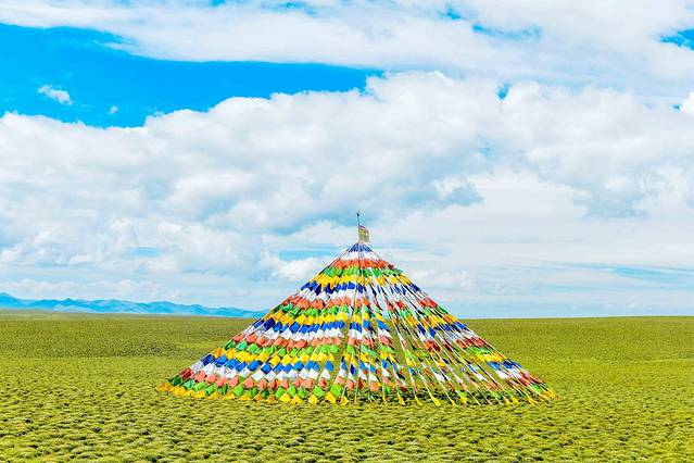 到达美仁草原时,有一场热情的欢迎仪式。这是草原为来此的游客、旅者准备的一份厚礼。与众不同的是,欢迎仪式上没有当地的居民,有的是代表了热情与吉祥的经幡。悬挂经幡是藏族独特的祈福方式,也是千百年来流传于藏民族地区的一种宗教习俗。五彩的经幡隧道就这样镶嵌在青绿的草原上,成为了一道独特的风景。无论是驾车,还是步行通过,在六百多米长的经幡隧道中,都能感受到满满的仪式感。尤其当微风吹过,五彩缤纷的经幡也随风而动时,一阵暖意与喜悦便会涌上心头。