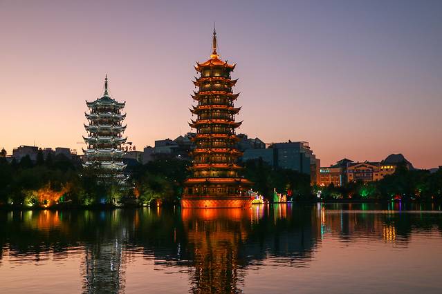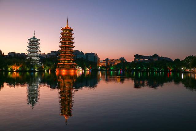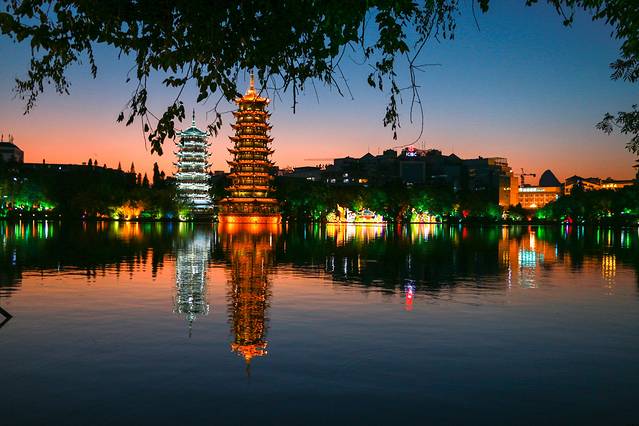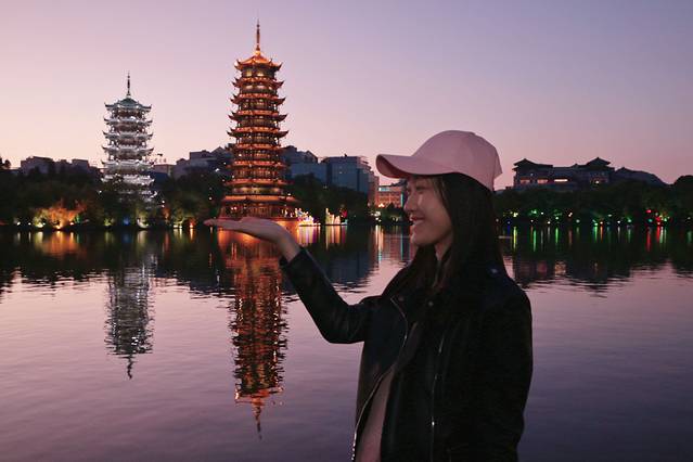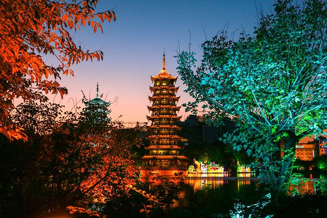 在象山公园的对面就是日月双塔,也是观赏两江四湖夜景的绝佳地方,夜幕之下,日月双塔交辉相应,把桂林装扮成另外一种样子~~~