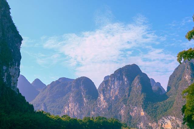 桂林的山水是秀气的,没有大海的澎湃,没有长江的气魄,也没有黄河的壮丽,它更多的是柔情,造就了桂林美如画的风景。“舟行碧波上,人在画中游。”很形象的描述了桂林的山水,当你置身其中,一座座山在漓江两岸连绵起伏,构成了一幅幅生动有趣的画面,你也便融入画卷之中~~~