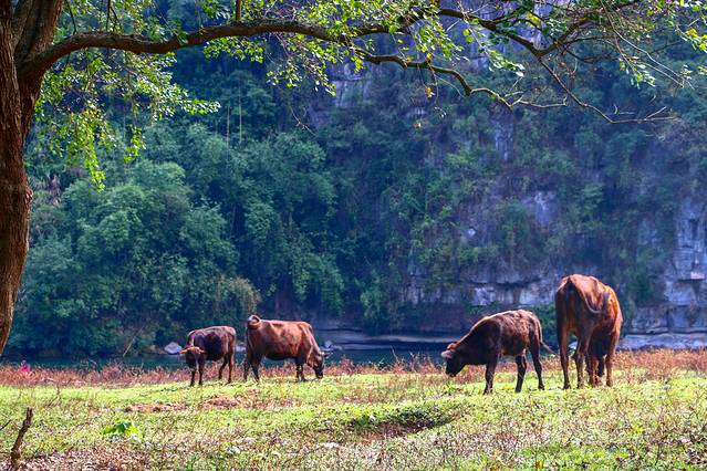 岸边有很多的老黄牛,一边喝着漓江水,一边吃着岸边的草,怡然自得~~~