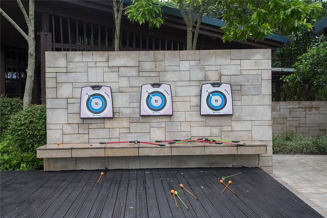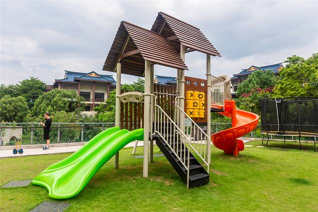 配有儿童乐园、滑梯、秋千、射箭区、沙池等儿童玩乐设施,