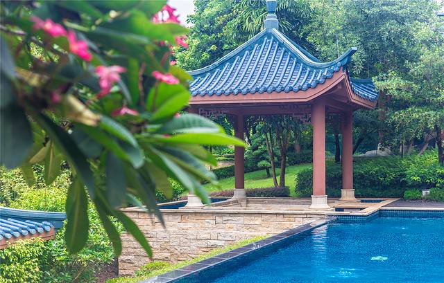 中国风韵味十足的建筑掩映在绿植碧水间。