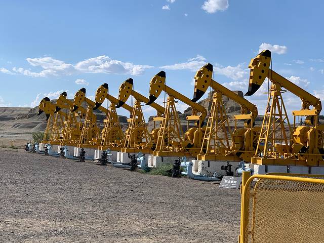 新疆的地名,我大都不熟悉,但克拉玛依石油城却是早已熟知。小火车把我们带到了魔鬼城内的石油文化特色体验区。我丝毫没有犹豫地下了车,近距离体验石油工业,了解石油开采文化。体验区内有一些废弃的“磕头机”,还有油气集输管路平台。走近磕头机,发现其管道内竟然还有新鲜的石油。克拉玛依(维吾尔语意为“黑油”)果然不愧是石油之城。
