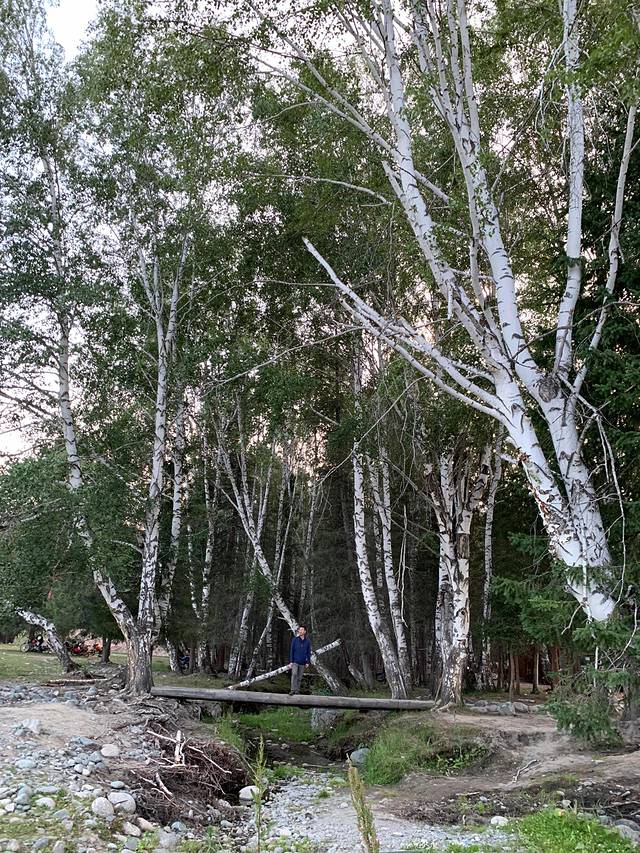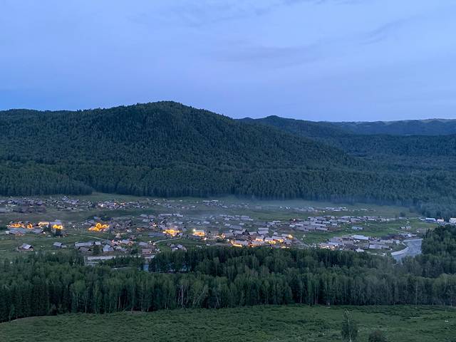 新疆的山实在是太大,在山坡上无论我们怎么奋力奔跑,一直跑到太阳完全落山,禾木村的灯光都已熄灭,终究也没能看到山坡的另一面是什么样子的。在将近凌晨2点的时候,我们下山准备返回小木屋。皎洁的月光之下,我们迷路了。不知不觉间,竟然走进了一户人家的院子,正巧屋里走出来一位图瓦族女子倒水。她看到我们,既没有责备,也没有惊讶,我赶紧向她问路。她似乎不会说汉语,但是能听懂,她向我们指了指门前的一条上坡的小路。沿着那条路,我们回到了我们所入住的小木屋群落里,但是月光之下的小木屋实在没有任何差别。情急之下,打开手机,百度地图里敲上“阳光小木屋D",印象中我们的那间小木屋的标识牌。熟悉的导航女声响起,这才发现我们的小木屋不过就在转身之处静静等候我们的归来。