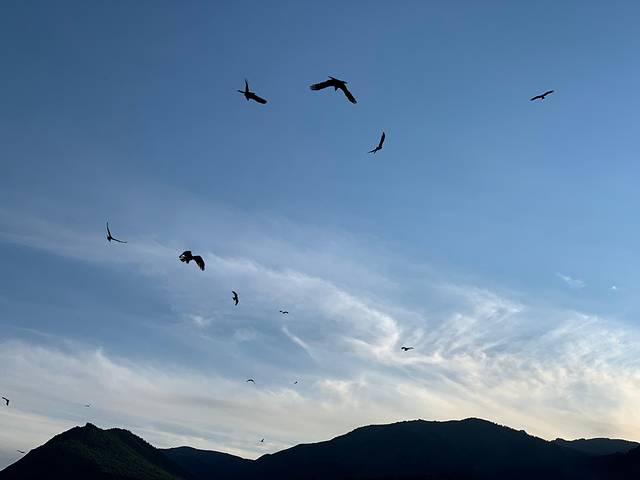 禾木村的老鹰特别多,村中心的餐饮广场上老鹰飞来飞去,大胆的人们向空中抛肉喂食老鹰