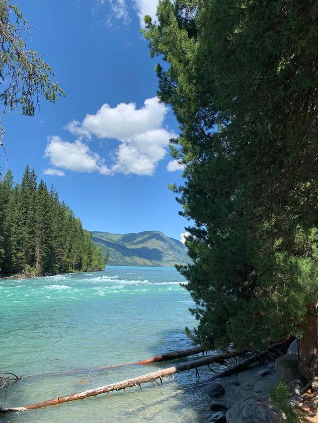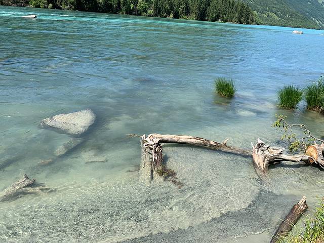很遗憾的是,由于道路整修,我们没能登上著名的观鱼台,一览喀纳斯湖的全景,更无缘看到湖怪。喀纳斯是蒙古语,意为“美丽而神秘的湖”。湖水来自奎屯、友谊峰等山的冰川融水和当地降水,面积约45平方公里,蓄水量达53.8亿立方米,是中国最深的冰碛堰塞湖,是一个坐落在阿尔泰深山密林中的高山湖泊、内陆淡水湖。沿着湖边的枯木栈道,看两岸雪峰耸峙绿坡墨林,浮木被强劲谷风吹着逆水上漂,湖光山色美不胜收,果然是“人间仙境、神的花园”。