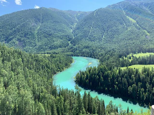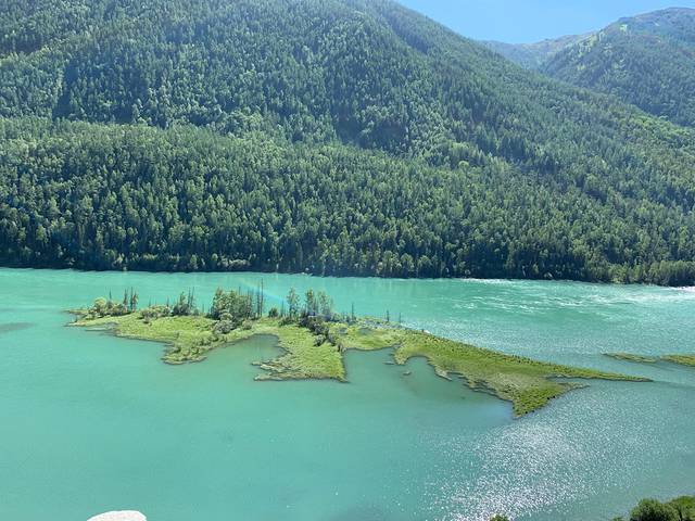 乘景区区间车离开喀纳斯景区,回程依次经过神仙湾、月亮湾、卧龙湾。
