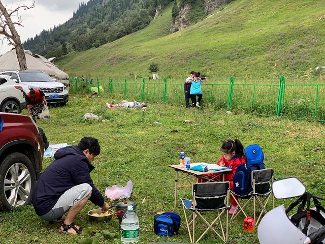 这一天正赶上新疆古尔邦节假期。小华山下,认真学习的小女孩,支灶烧饭的父亲,就地而卧的大姐,窃窃私语的小情侣,一派悠然自得的假期自驾游风光