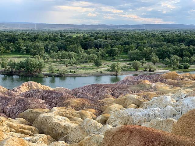 五彩滩属阿勒泰地区 ,在布尔津县境内,地貌属于“雅丹”地貌,河岸岩层抗风化能力强弱不一,轮廓便会参差不齐,而岩石含有矿物质的不同,又幻化出种种异彩,因此得名“五彩滩”。毗邻碧波荡漾的额尔齐斯河,与对岸葱郁青翠的河谷风光遥相辉映,可谓“一河隔两岸,自有两重天”。