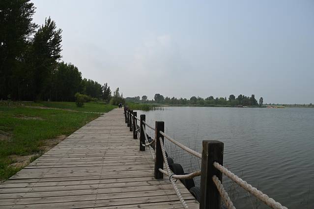 沿湖边堤坝栈道走到公共服务区(厕所)处,有一个大型导览图的牌子,牌子的后面就是亲水栈道,如果是步行的话,从这里穿过去还是比较有意思的。
