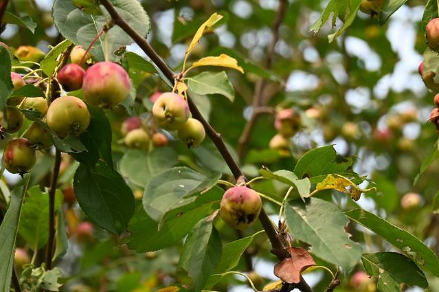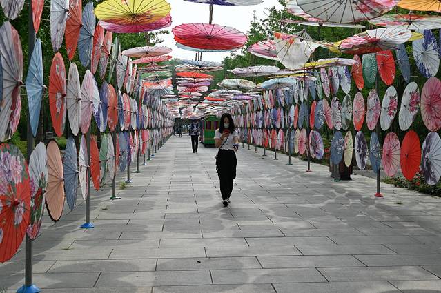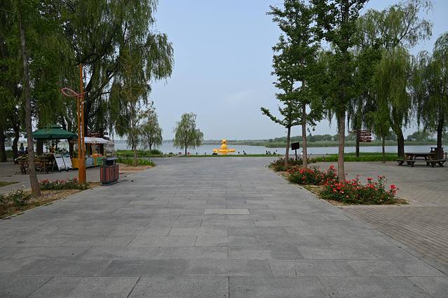 走过花伞长廊,两侧栽满海棠树人行步道直通湖边。