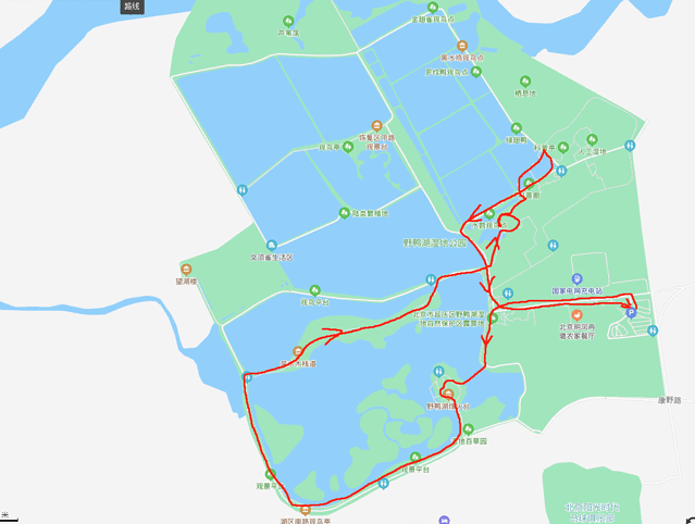 野鸭湖湿地公园大部分水域都没有向游客开放,红色的线路是本次游览的行走路线,基本上吧可以去的地方都走了,其他地方还在休养当中,有栅栏封路不能前往。