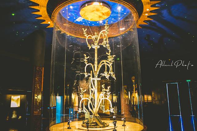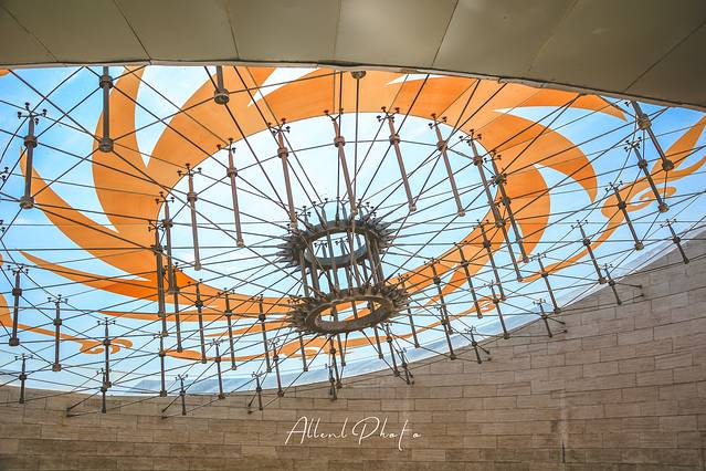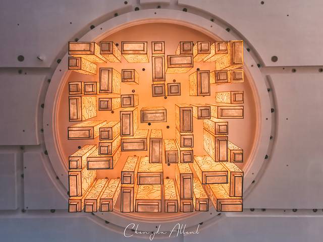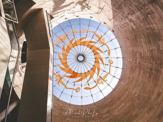 大厅穹顶的设计别具一格,绘制的图案正是金沙遗址最经典的元素——太阳神鸟。