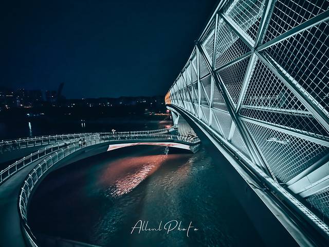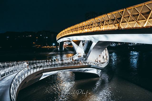 五岔子大桥横跨锦江,是一座连接成都高新区桂溪和中和街道的人行桥梁(非机动车也可以通行),由主桥和副桥两座桥梁按照类似“莫比乌斯环”的三维设计环绕而成,极具曲线美和未来感!夜间的灯光效果大气而绚丽,更是凸显了大桥自身所独有的流线美和科技性。