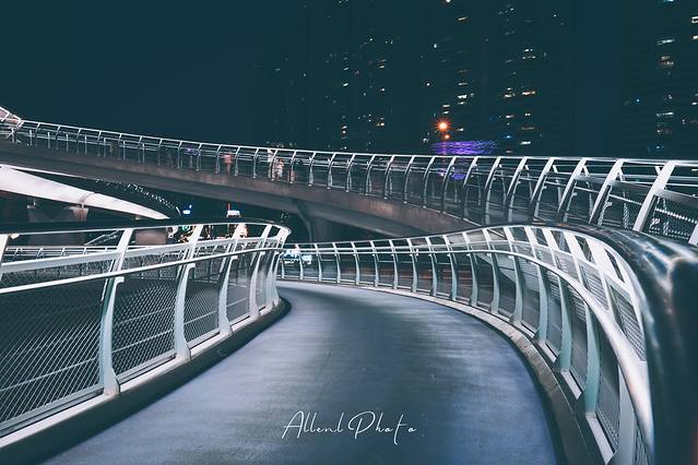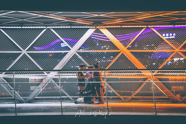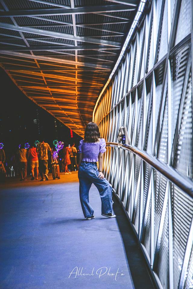 桥体的灯光会在暖色和白色间切换,通道里的人仿佛处在一个神秘的光影隧道中,很有赛博朋克风。