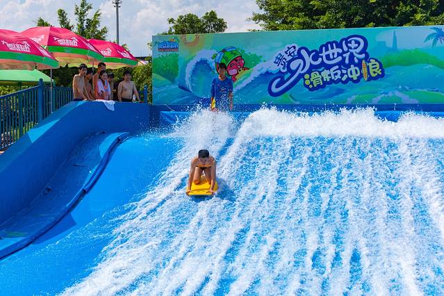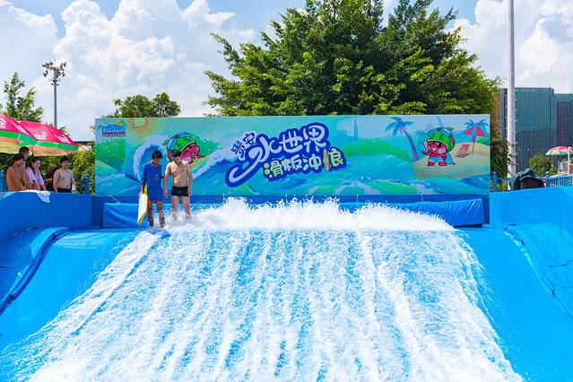 不用去海边,也能冲浪。在水世界里有专门的滑板冲浪项目,还有专业的教练指导,即便是不会的新手,也能迅速学会一两招,体验感极强。