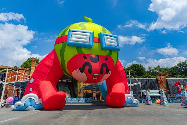 正值暑假,贵安水世界正在举办浪里个浪西瓜嘉年华,还没进门,就被眼前这个巨大的卡通西瓜形象给萌住了,超级可爱。