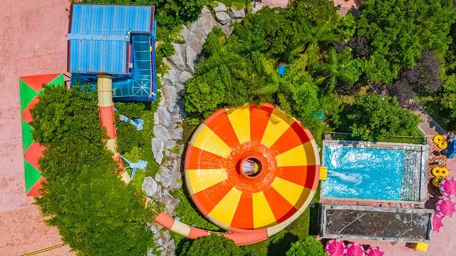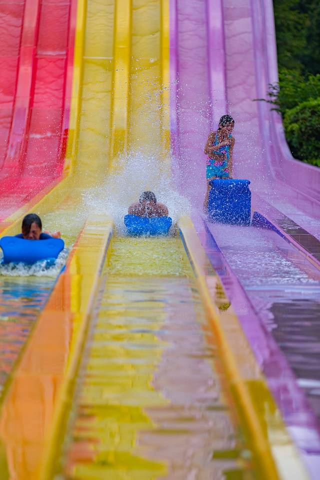 彩虹竞技也是乐园里很受欢迎的项目,它由6条彩虹道组成,从几十米高的顶端俯冲而下,仅仅数秒钟,便冲到终点,刺激感可想而知。