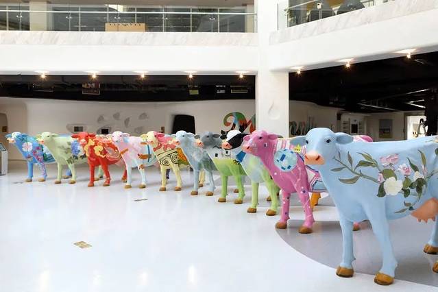 走进大厅,正对门摆放的创意花纹的奶牛,个性十足,非常适合和朋友一起打卡拍照。热情的工作人员为我们递上同样印有奶牛花纹干净卫生的鞋套,旁边就有大片的换鞋套的长凳,流线型的设计,好像流动的牛奶,既人性化又充满设计感。