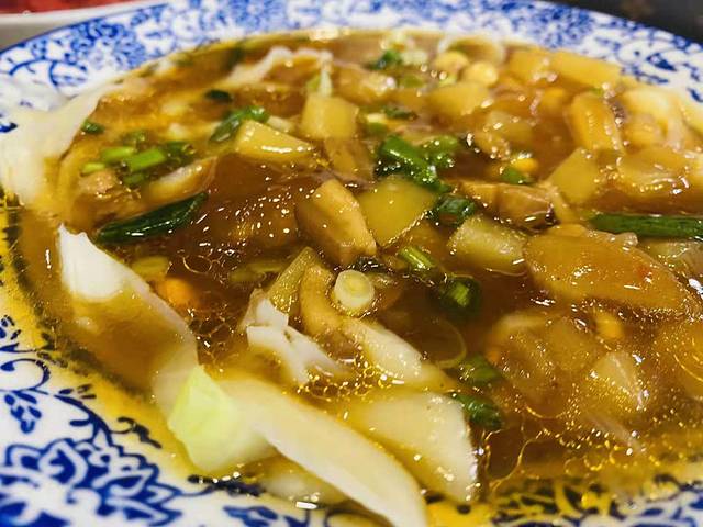乔家喇嘛肉用精致的瓷盘乘上来,入口顺滑,微甜,口感类似于我爱吃的锅包肉,但又没有那么粘稠硬朗,恰到好处。