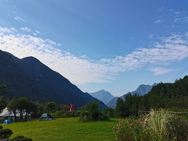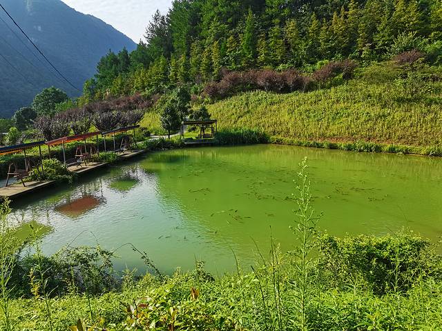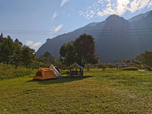 特别值得一提的是我们住的酒店——百花谷度假酒店,给了我不少惊喜。整个酒店坐落在百花谷景区当中,房间在山间小路两旁依次排开,有庭院、房车、吊床、帐篷等选择各具特色。开着车进入酒店,从山腰缓缓驶入谷底,越发显得幽静凉爽。纵使山顶艳阳骄烈,谷底在山峦的庇荫下如同世外桃源。再配上蓝天白云,从深处一眼望去,令人流连忘返!当夜幕降临,整个山谷偶尔回荡着各种鸟虫的鸣叫,如同交响乐一般令人亲近放松。在草坪上搭起烧烤架,炭火缭绕、滋滋作响,三五好友畅饮交谈不亦乐乎,十足的烟火气息!晚饭后散步在酒店的主干道上,配上皎洁的月光,夜色朦胧迷人,仿佛置身于油画中,走进了童话世界。能让久居城市空调房的人们忘却一切烦恼。酒店房间以板房为主,住宿条件虽比不上星级酒店,但也还干净整洁,胜在环境怡然。房间价位200-500不等,其实个人挺想住下房车,但是空间略小。人生乐于不断尝试新鲜事物,感知自己视线以外的世界!