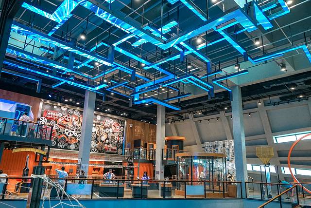 整个科技馆建筑面积10000平米,共设置了五大通龄展区,一共有五层,每一层都有自己特别的主题与展示方向。