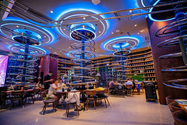 小憩完继续出发,到达SPACELAB失重餐厅,一进入真的惊艳到我了,以极具科幻的蓝色为基调的店铺设计,各种轨道、灯光、场景相互交融,仿佛进入到一个科技星球。