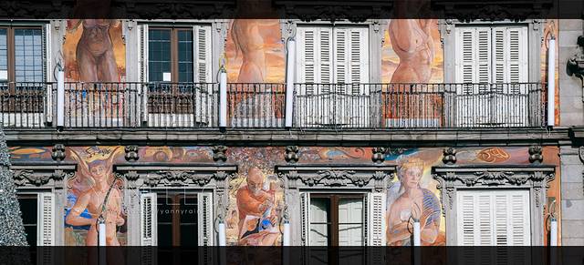 广场内的这些壁画非常有意思吧!是1989年马德里委托赢得竞赛的西班牙画家Carlos Franco设计绘制的。