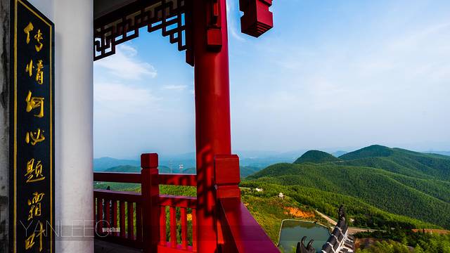 如果想要从高处俯瞰竹海的全貌,建议直接驾车行使到观海楼(如果没有停车位可以先把车停在观海楼下面的一个观景台,那边有停车位),登上观海楼可以从高处看到远处竹海的风貌。站在阁楼上,首先看到的是柱子上的一幅对联“传情何必题霜叶,作简应该念蔡侯”。当你从楼上俯瞰的时候就会明白那副对联的含义。倚楼听风,即便是在夏天,也还是能感受到满满的清凉,以及淡淡的竹子清香。