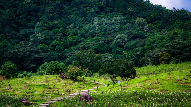 走过石桥,眼前忽然变得豁然开朗,一座载满了树木的山丘浮在眼前,满眼的深绿色再也容不下其他。一磴磴窄窄的石阶在远处一转就没有了尽头,两边是满地的鲜花,不忍心去采一朵,只能拍个照去留住它们这短暂的芳华。