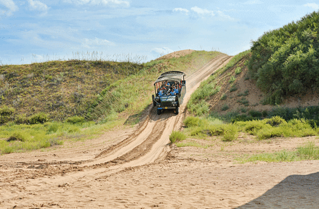 西岸为中国第七大沙漠——库布其沙漠旅游区,项目有大型马术实景剧、沙漠冲浪、沙漠小火车、骑骆驼、沙漠越野车、沙漠卡丁车、沙漠滑索等。