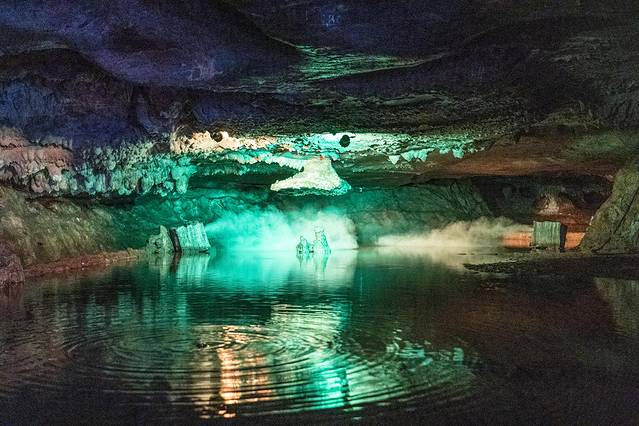 太极洞水洞亦为一奇,其水面开阔,可容小舟倘徉其间,任意东西。如乘小舟游水洞,只见洞壁上的奇石,在五色光的照耀下,灿若群星,使人有置身银河之感。