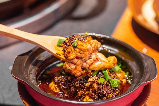 店内必点的东西自然是脑花,“无血水,无异味,更入味”是店内的追求,所以除了新鲜之外,脑花的口味搭配也是多种多样的。从“宝匣”中腾云而出的新鲜脑花,在火锅里煮至熟透,这样脑花最鲜嫩,也是最地道的重庆吃法。除此之外,还有麻辣、蒜香、剁椒等多种味型的冒脑花,我和朋友分别点了麻辣和蒜香,总觉得麻辣冒脑花吃出了辣条的美味。