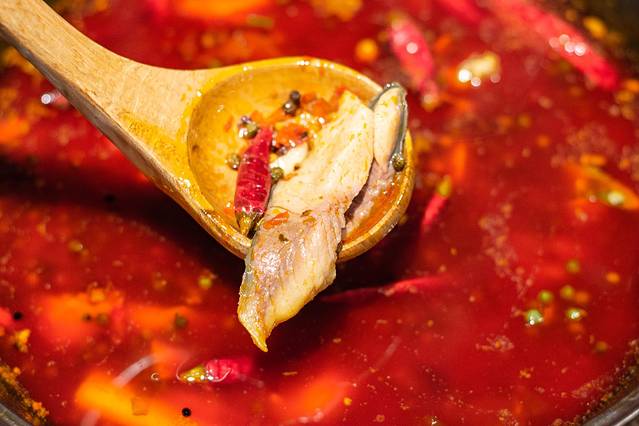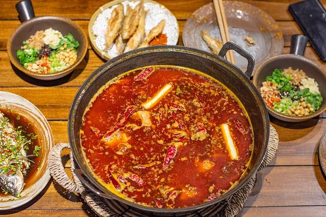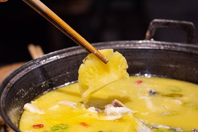 在渔夫鱼仔,鱼火锅的锅底一共分为老成都人最爱的经典红汤锅和古法酸菜锅。当然,对于不喜欢吃辣的人还可以选择柠檬锅仔姜锅,这种口味的鱼锅内,还有菠萝的加入,是汤锅的酸甜口味也更加的浓郁了。