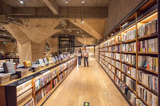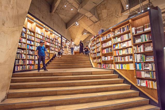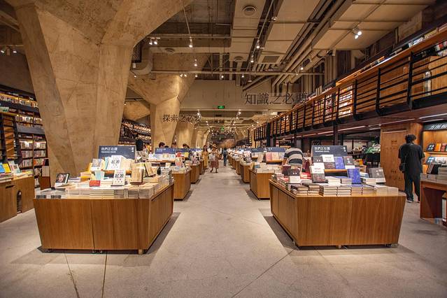 其实书店的正门并不花哨,或许我们还可以用简约进行形容。但是,从正门而入进入书店内部则是另一番的景象了。书店的内部空间就像一个巨大的殿堂,约2层楼的高度类似简约的工业风空间设计,混凝土粗糙儿简朴的墙面下是木质的书架,暖暖的灯光照在书籍上,在此心也自然的平静了下来。