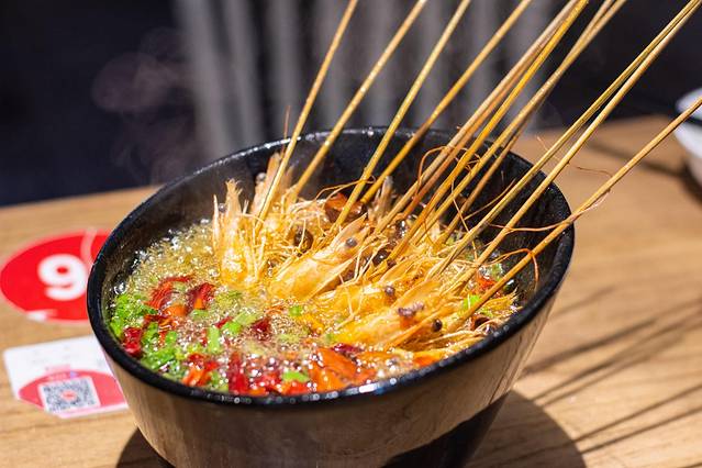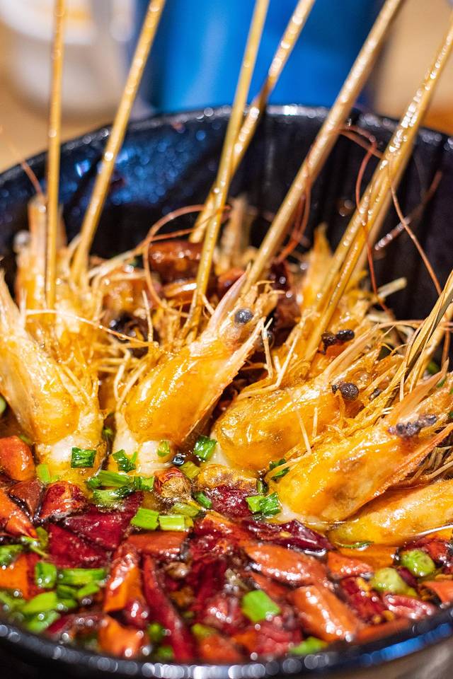 进店最推荐的还是裸奔坨坨虾、和一鱼两吃的特色烤鱼边。前者,是将新鲜的明虾去壳,串在竹签上,然后同辣椒、葱姜等佐料一起放在容器内,上桌时再淋入热油,然后靠着沸腾的热油将鲜虾烫熟,这样一来既保留了虾子鲜嫩的口感又辣味十足,很过瘾。后者则是将鱼肉和鱼骨分离,鱼骨炖汤鲜甜可口,而鱼片则是做成鲜香麻辣的烤鱼片,这样一鱼双吃的做法真的很适合南方人。