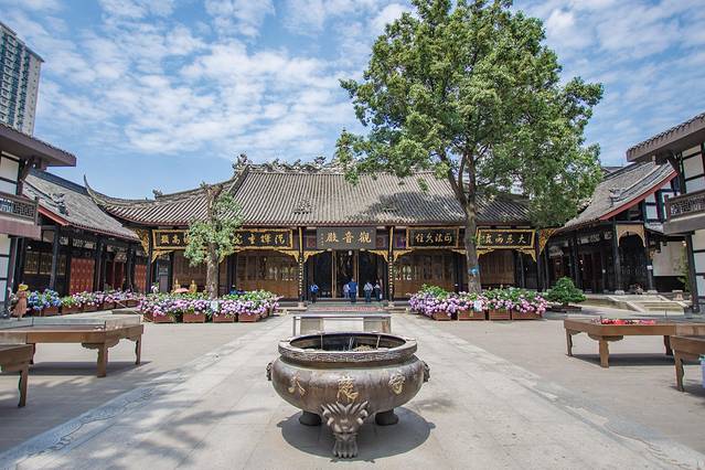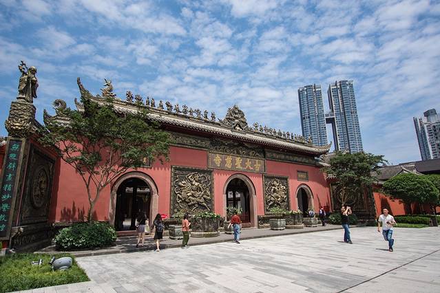 如今,大慈寺就处在成都的闹市之中,在其周边便是成都市区最为热闹的春熙路和太古里了,不管是什么日子这一片都可以说这里都是来来往往的人群。即使如今,大慈寺依旧保持着自己的古朴和幽静。寺庙中只有诵经的僧人和前来礼佛的香客,这就是闹市之中的寂静之地了。