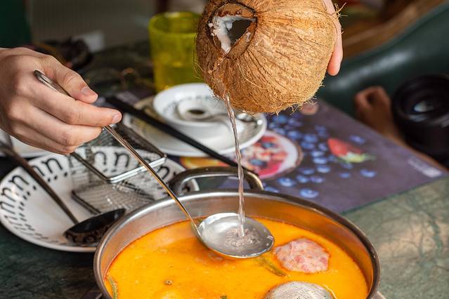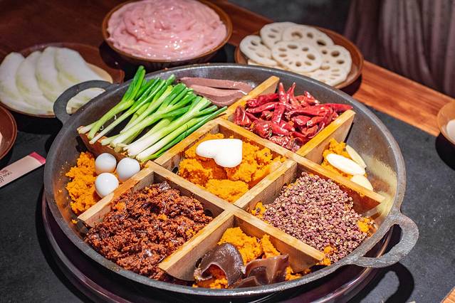 如果你厌倦了成都老火锅的麻辣口味,不妨试一下加入了椰汁的集渔泰式海鲜火锅。之前在海南吃过加了新鲜椰汁的椰子鸡,而这次在成都也吃加入椰汁的浓浓冬阴功火锅。除了地道的火锅汤底,店里还有五种不同口味的酱碟供你挑选。
