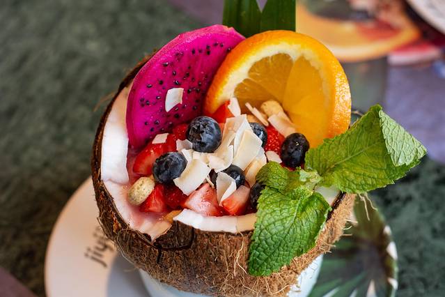 不过,对于马上就要到来的夏天我还是比较想推荐一下餐后的甜点,网红椰子碗。掏空后的椰子壳里装满了冰沙和草莓、蓝莓等各种水果,这样的搭配尤其适合成都闷热的夏季。