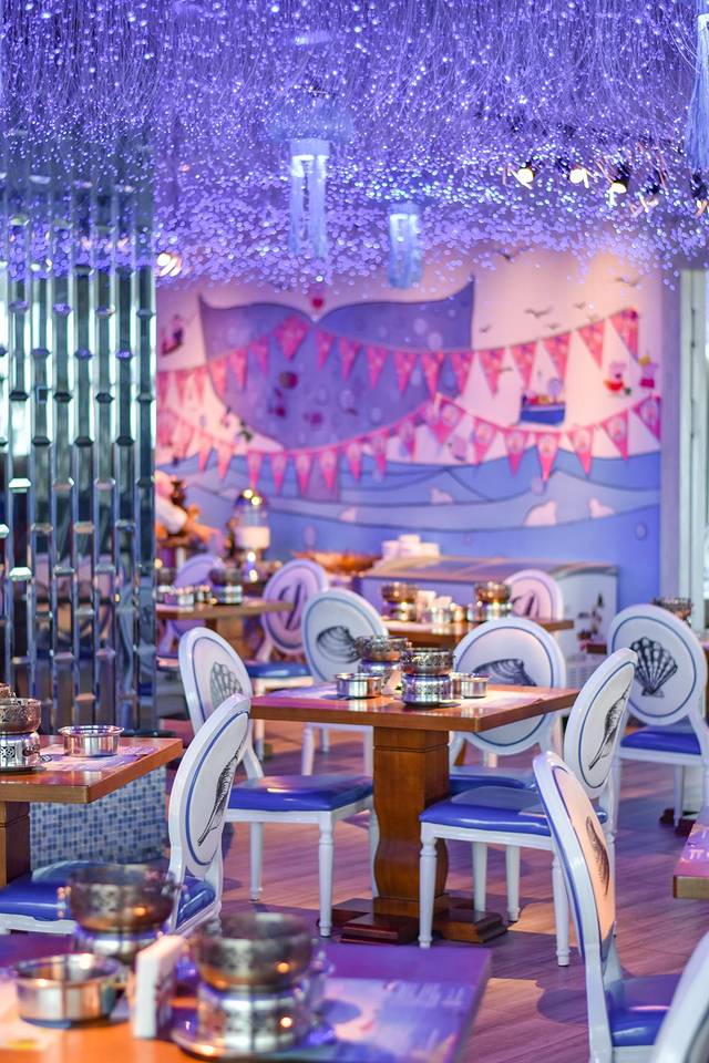 这家餐厅,可以说是当之无愧的网红餐厅,我们早早去还是没能逃过排队的命运。如果你问这家餐厅的红在哪里?我可能会告诉你因为餐厅里有一片蓝色的星空~~当你在餐厅用餐时不妨抬头,你会发现餐厅的天花板是一片蓝色的海洋。这片星空可是大有来历的,它是由由法国空间设计大师、韩国灯光设计大师和美国3D技术专家历时2年共同打造而成的海南省首家感官级别的3D餐厅。同时,它也是亚洲排名前50名的餐厅。
