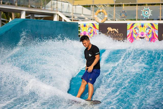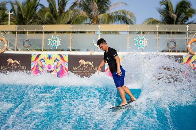 在酒店里,午后的时光除了可以在泳池里享受惬意的慢生活,还能在享受到刺激的陆地冲浪。酒店精心设计的冲浪模拟器可以打造出不同水流速度和高度的逆流水浪,在从下至上水流中逆向快速移动,就像冲向大浪的浪尖,让你体验源源不断的冲浪快感。这样的冲浪体验,尤其适合追求刺激、爱好挑战的时尚人士游玩,相比海上冲浪,陆地冲浪更易操作,更安全。