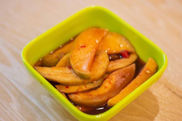 店里除了各种解暑降温的冰饮,还有特色的崖乡粉、面和饭。当然,还有适合闲暇时光的小吃,其中比较推荐的就是崖乡腌芒果和虾饼了,虾饼对于许多人来睡哦可能并不少见,在福建的早餐这是很常见的一种小吃。而崖乡腌芒果则是第一次见,不过经过腌制后的芒果口感很脆,也是一种不错的体验。