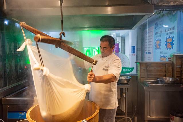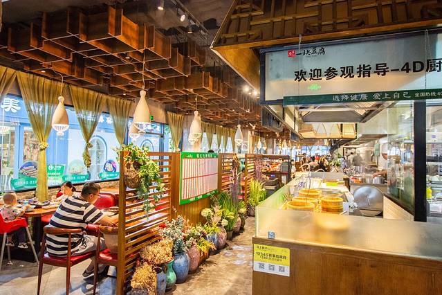 在略显古朴的就餐环境了里,你可以通过玻璃橱窗看到完整的豆腐制作流程,也可以在开放式的餐厅里看到忙碌的师傅和每道菜品的制作过程。