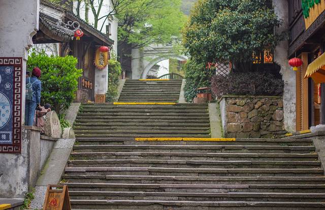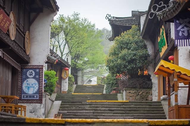穿过南山茂密的竹海,搭乘地面缆车前往位于竹林深处的鸡鸣古村。古村处在苏浙皖三省交界之处,因鸡鸣可达三省,所以也就有了鸡鸣村这个名字。春雨后的山林有着淡淡的雾气,走过村口的古牌坊,沿着石阶逐级而上,路旁是售卖着苏浙皖三省风物的特产店和茶馆。