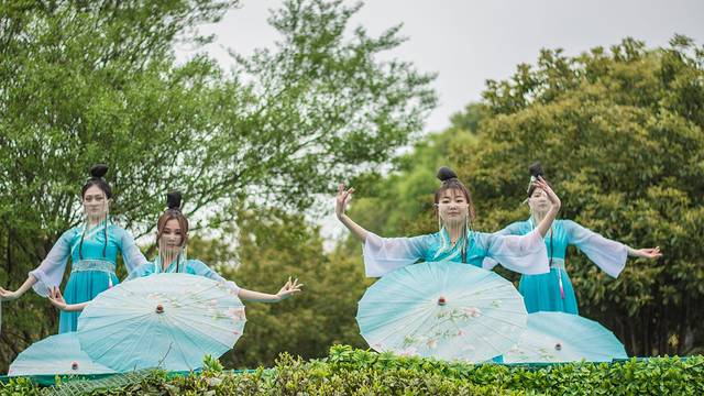 从景区大门处乘船前往茶岛还是需要一定时间的,好在船上有古筝和茶道表演,打发了这段阴雨天无法看风景的无聊时光。下船抵达茶岛之后,在茶园之上有伴着《琵琶行》翩翩起舞的“茶娘”这是景区内固定的文艺表演项目,如果有来山水园一定不能错过这段精彩的表演。