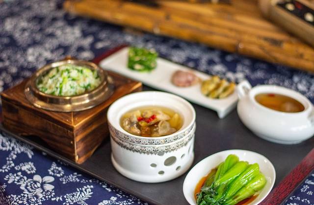 御水温泉的御膳楼,是汇集着南山山珍和天目湖鱼鲜的好地方。这里的厨子用南山和天目湖内的天然绿色原料精心烹制了几套养生套餐。除了清明时节的一碗清热利湿的荠菜粥之外,餐厅内套餐的主食以腊味乌米饭和石锅腊味饭为主,而乌米饭则可以说是溧阳的本土特色了。农家的乌米加上农家的腊肉,蒸出来的不仅是浓浓的溧阳味,更是激发了乌米补肾健脾、安神明目之功效。