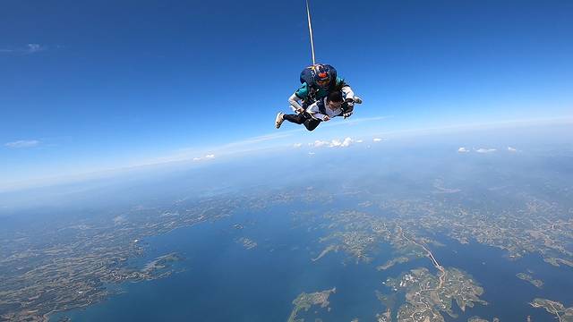 在天上看的风景真的说不出的没。照相机也拍不出来。还是自己感受了才知道。落地之后特别开心,大家都哄过来用手机拍你,为你鼓掌,特别地热情。真切地感受到了运动的魅力。